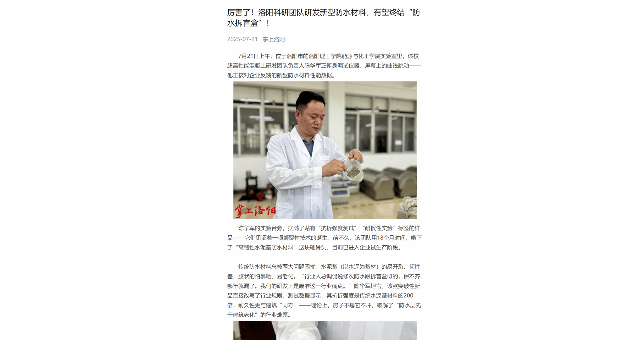 2025-07-23 14:55洛阳理工学院攻克防水材料难题:新材料与建筑同寿,成本降三成