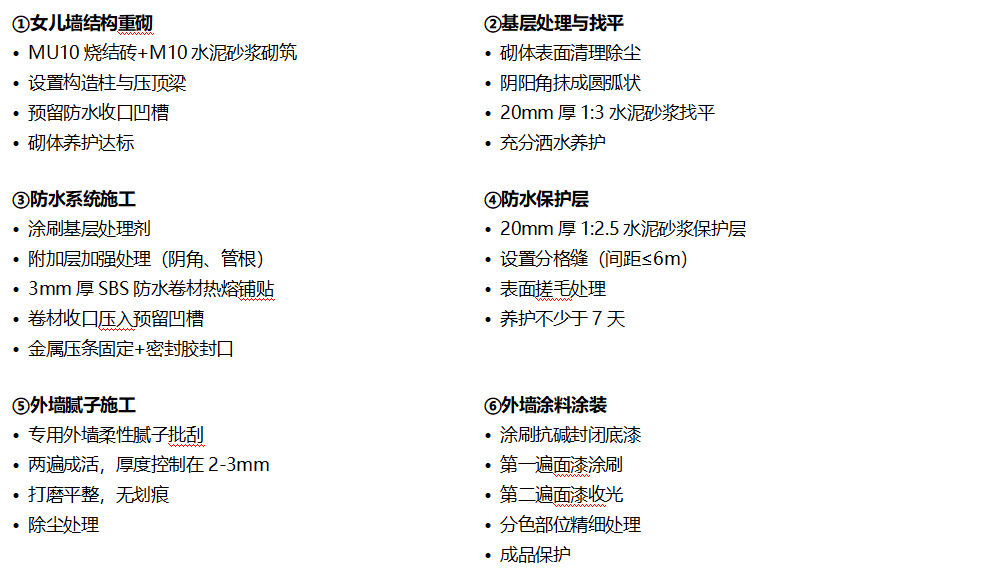 采用结构重砌+防水再造+涂装恢复完整工艺体系,分阶段实施规范化施工: